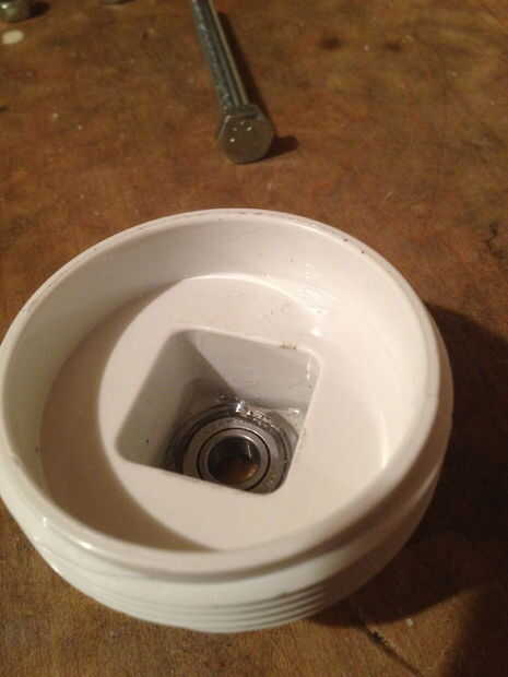 Dejar caer el rodamiento en el interior cuadrado de espacio de la tapa, luego epoxy en lugar de llenar el espacio alrededor de los cojinetes y las paredes de la tapa en las esquinas. Asegúrese de que no se epoxy en el cojinete o donde será la cabeza de la tuerca o el perno (que debe girar libremente). Usted puede raspar el epoxi si va donde no debe cuando se seca, pero es más fácil si no tienes a.)