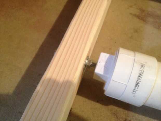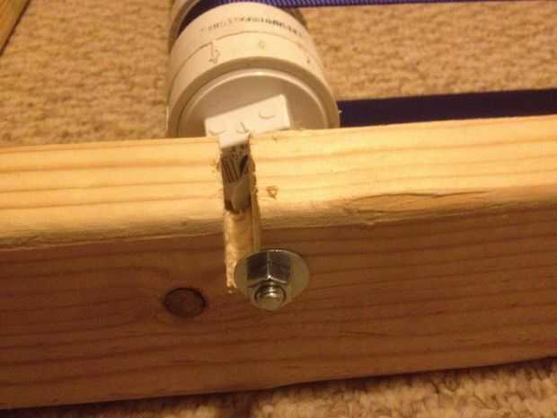 Cortar la madera, luego Taladre los agujeros para los tres rodillos. Sujeta el 2 2x4s juntos y me perforaron a través de ambos a la vez para que los orificios se alineen. Taladre los orificios aproximadamente 1" de la parte superior de la 2 x 4 para que los rodillos de despejar el terreno y palillo para arriba sobre la parte superior de la estructura un poco.