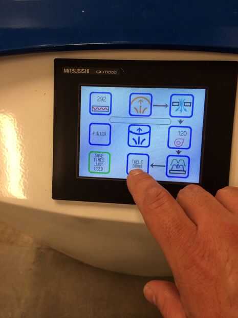 Después de pulsar el último botón en el paso anterior, presione "Start" y luego "Configuración de carga actual" para que aparezca el flujo de trabajo. Poner el molde en la platina y presione y pulsado "tabla" hasta que baja la fácil hacia abajo. Coloque el material en la Junta y fijarlo con la abrazadera. Puede que necesite ajustar las pinzas para obtener una buena cantidad de fuerza.