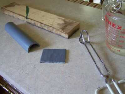 Foto es un trozo de media de PVC que había sobrado de otro proyecto. La Plaza plana hizo cortar una pieza de la media ronda y calefacción mientras que el agua en la taza Pyrex hervido en el microondas durante dos o tres minutos. He quitado la taza del microondas y utiliza la pinza para tirar de la pieza de PVC de la agua muy caliente. Las tenazas también ayudaron a desenrollar el PVC suave para poder colocar la pieza de madera sobre él y mantenga plana contra la mesada hasta que frío y firme. En la ausencia de un buen suministro de plexiglás, algunos PVC aplanada con la ayuda de un microondas y agua caliente ofrece cierta versatilidad improvisada.