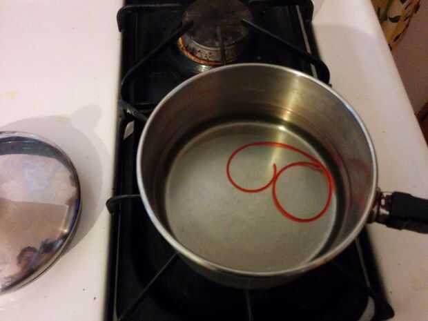 El filamento de la gota en el agua hirviendo y deje que se caliente durante al menos 10 segundos. Sacar con una cuchara. La consistencia es como un tallarín cocido.