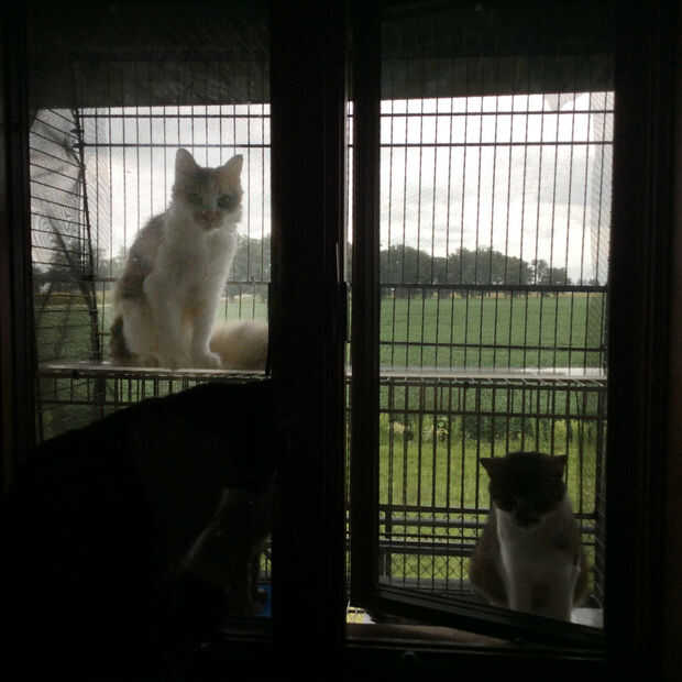 - Un veterinario en YouTube tenía una manija debajo de su ventana, atado al gato a (que fue exitoso para mantenerla en su lugar)