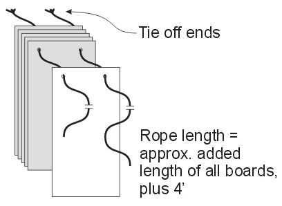 En el siguiente diagrama, la cuerda sería aproximadamente 16' largo, o, 2' (longitud de cada tabla) x6 (circunferencia aproximada), + 4' (cola).