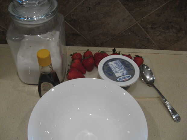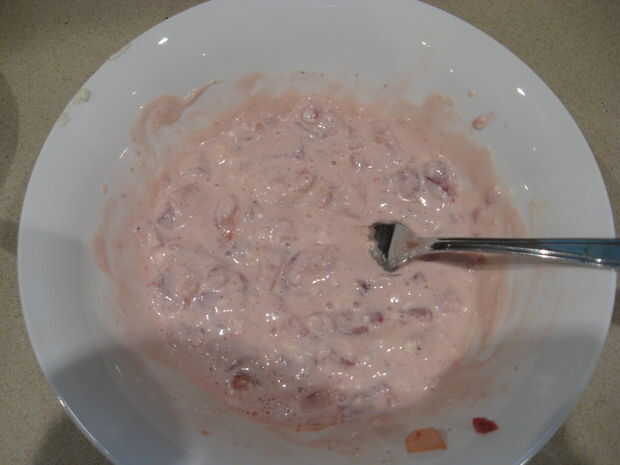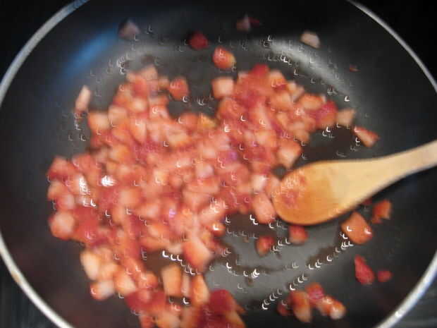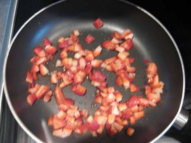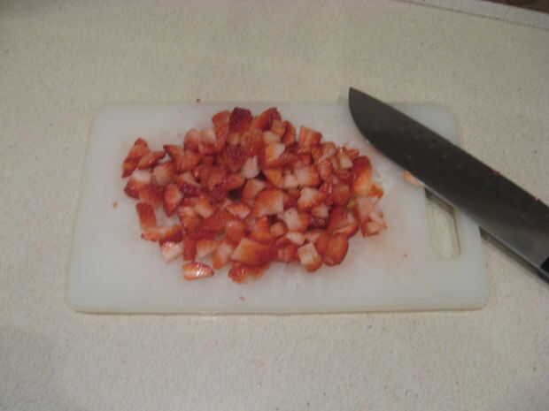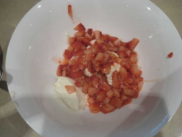 Este proceso es muy fácil. Groseramente dados unos 15 fresas, hasta que tenga todas las piezas menos de 1cmx1cm. Añadir los trozos de fresa a una sartén pequeña a fuego medio. Añadir 2 cucharadas de azúcar blanco y 3 cucharadas de agua caliente, revolviendo ocasionalmente. Cocinar hasta que las fresas estén blandas, aproximadamente 5 minutos y coloque en un tazón mientras esté todavía caliente. Agregue 5 cucharadas de queso crema y un toque de vainilla y mezclar hasta que la mezcla es homogénea en el color, excepto los trozos de fresa.