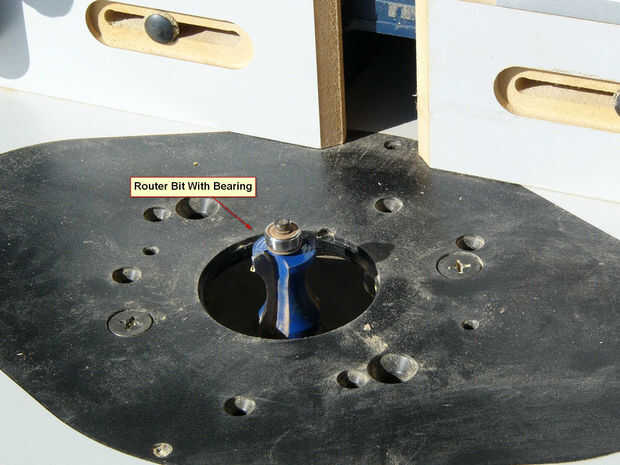 Como se muestra en las imágenes, la madera y la plantilla con cuidado fue trasladado a la broca de fresadora. La idea es que la relación con la broca de fresadora se limitaría la cantidad de corte de la broca porque el cojinete montaría en el borde exterior de la plantilla lo que limita el corte de madera. Este trabajo a un punto, pero varios problemas existen haciendo la ruta de esta manera:
