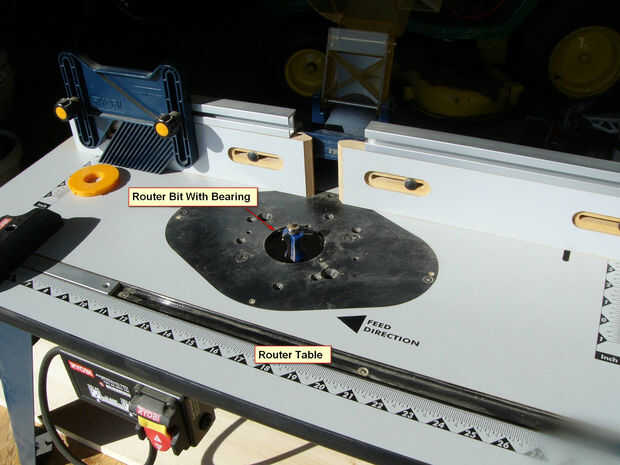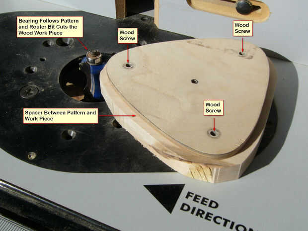 Mi primer intento varias en la fabricación de estas piezas era utilizar una mesa de router, un router y una broca que tenido un rodamiento de bolas. La idea era poner la pieza de trabajo madera corte áspero a la plantilla mediante varios tornillos de madera. (Entre la madera áspera y la plantilla era arandelas espaciadoras delgadas que son necesarios para separar la pieza de madera que se corta de la plantilla, esto permite que el rodamiento router traza la plantilla y la broca de fresadora para cortar la parte de madera).