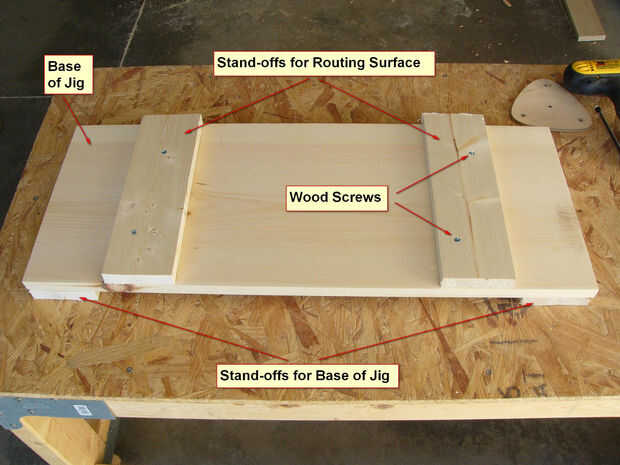 La exacta colocación de los separadores de madera no son críticos. Lo único que necesita calibrado es asegurar que los separadores que se muestran en la parte superior de la plantilla se adaptan a la anchura de la Junta de superficie router cortes. (Ver siguiente paso).