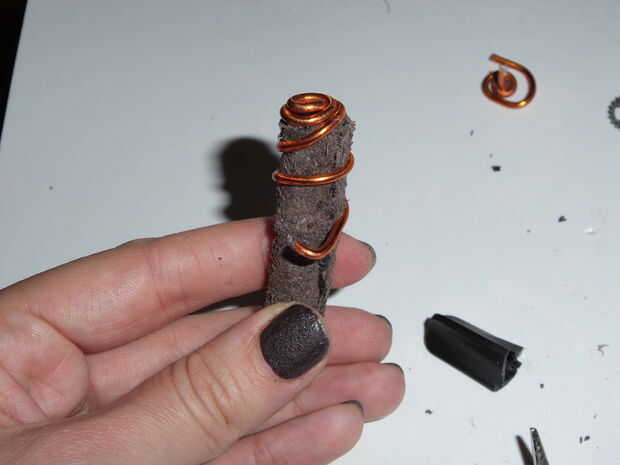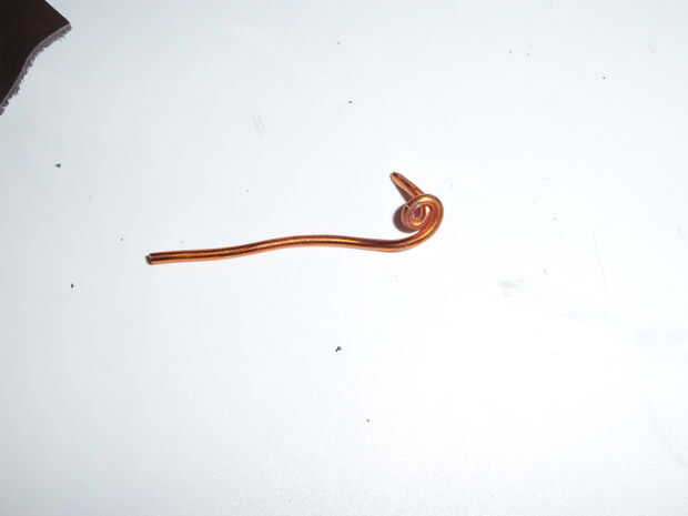 Para cubrir el extremo de la aguja utilice un trozo más grueso color del alambre de cobre. Hacer una espiral con el mismo diámetro que la aguja y un alfiler en el centro. El final debe ser aproximadamente 10 cm de largo.