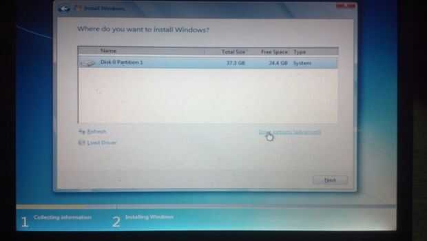 Después de ejecutar la instalación de windows 7, el instalador le preguntará al tipo de instalación. Haga clic en "Custom (advanced)" que es la segunda opción.