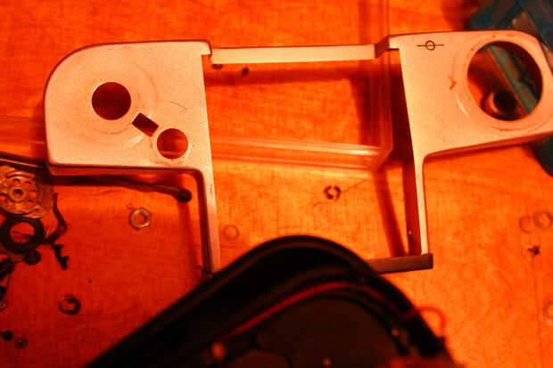 la longitud de la película 120/240 marca y ambos tienen compresión en la parte superior de la caja del selector de la velocidad del obturador. tratando de no doblar el caso, con los alicates del gancho agarrador em y gire hasta suelto. gire más y caerán hacia fuera.