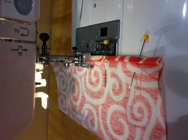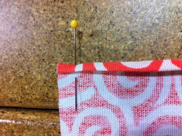 Para hacer el dobladillo en la guarnición, doblar 1/4" de la tela y hierro (Asegúrese de que está al lado de la tela que será la parte superior). Doblar la mitad de esta parte planchada en sí mismo y hierro otra vez. Ahora debe tener un 1/8 pulgada planchada de doblaje. PIN down con las clavijas perpendiculares al redil. Recta puntada del doblez - asegurándose de que al sacar las clavijas a medida que avanza.