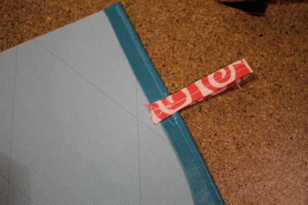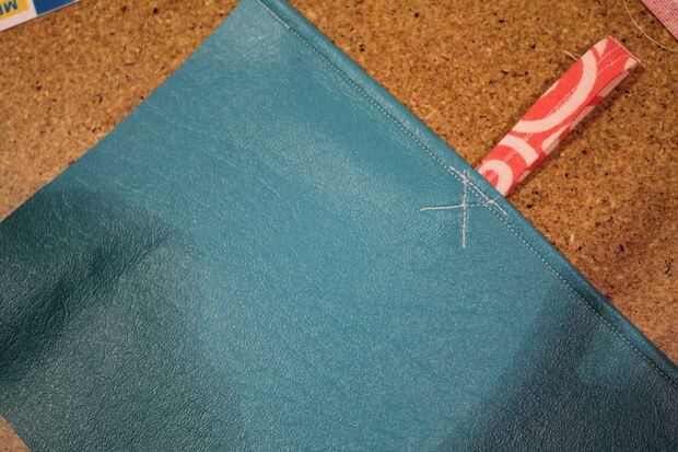 Pin la correa en el lado "malo" de la pieza exterior de la tela.  Puntada recta cerca del borde.  Para mayor resistencia, una "X" en el resto de la correa de la puntada (ver segunda foto).