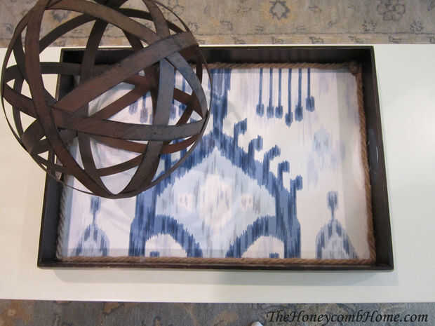 Me acordé que tenía algunas muestras de tela grande en el armario así que decidí utilizarlos. Ordenar muestras de tela de tamaño más grandes es una gran manera de ahorrar dinero si usted sólo necesita una pequeña cantidad para un proyecto. Yo les he usado por muchos proyectos, incluyendo la estructura para la decoración de la pared. Las imágenes después fueron tomadas en mi habitación antes de que llevé la bandeja a casa de mi hija.