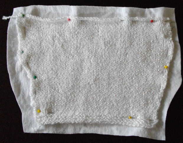 Prender las piezas bloqueadas en la tela de forro y cortar la tela dejando un margen de costura sobre una 1/2 pulgada de ancho alrededor de los lados de cada pieza.