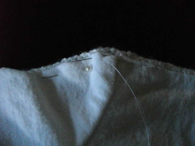 Una vez que todo el revestimiento se cubrió, coser los dos juntos, usando una aguja fina, emparejar los hilos y puntadas pequeñas. Creo que esta parte es mejor coser a mano. Daría miedo que el pedazo hecho punto cogería en la alimentación de perros en la máquina de coser o puntos de sutura punto cogería en el prensatelas si cosió lo punto lado. De cualquier manera, no merece la pena arriesgar todo tu trabajo y realmente no tarda mucho en coser alrededor de la chompa a mano.