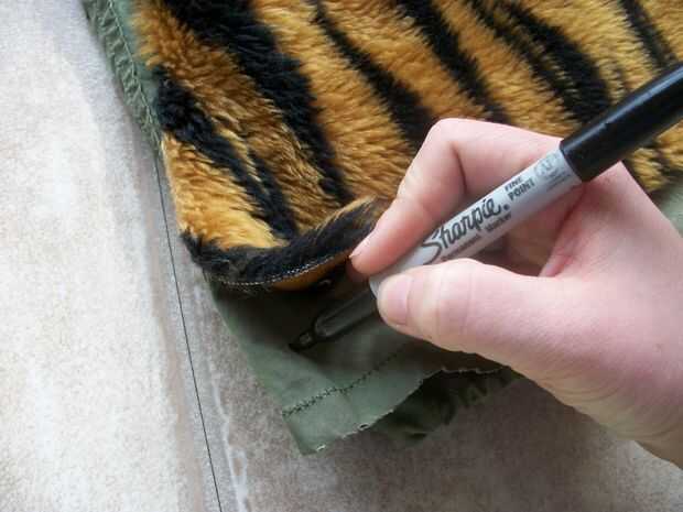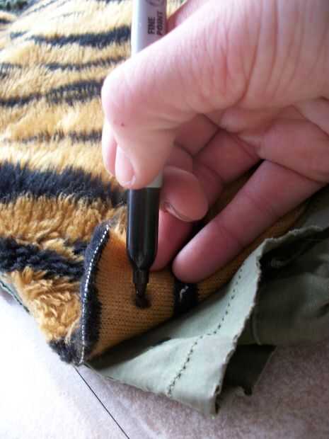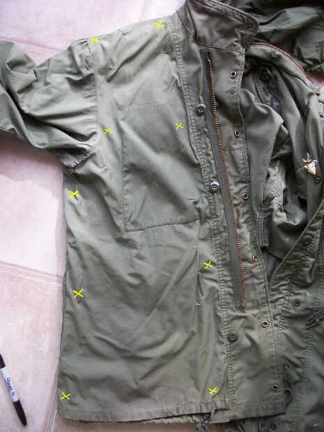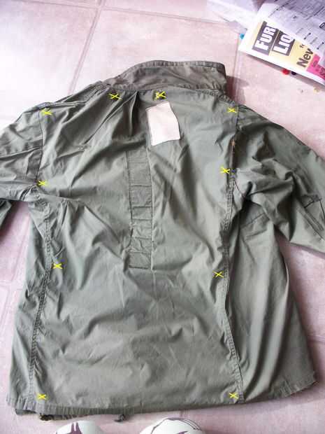 Vamos a empezar con la parte posterior. Coloque la tela en el interior del panel posterior de su chaqueta (que será cuando hayamos terminados todo). Utilizar el marcador o tiza, levante la esquina de la tela y marcar un poco la chaqueta y la tela donde estará el botón y su correspondiente agujero. Marque las cuatro esquinas. Usted también querrá uno o dos botones entre las esquinas. X imagen muestra donde hice mi marca.