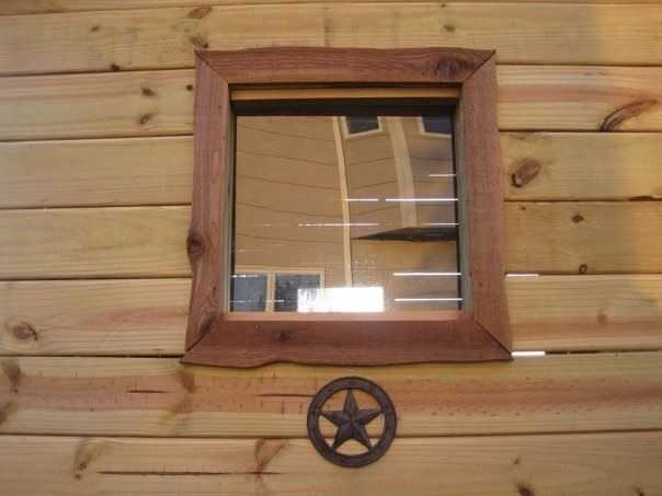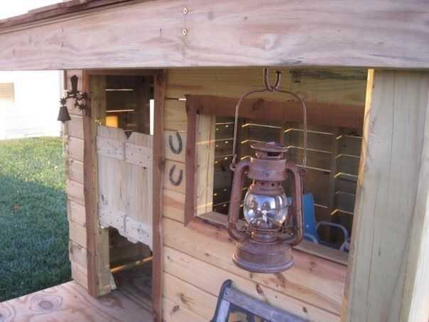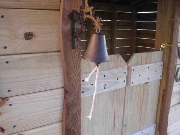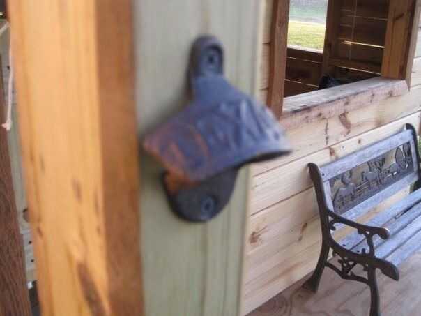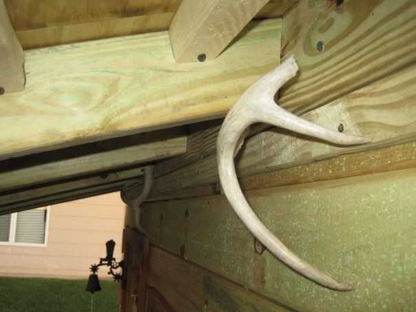 La buena: para recortar los marcos de las puertas, utiliza placas de cedro áspero cerca. De carácter un poco, utilizando una sierra de calar, corté una línea con curvas hacia abajo por la mitad, va alrededor de los nudos en la madera. Estos fueron clavados en su lugar. Las puertas del salón fueron creadas de desechos de las juntas de cerca pino estándar. La campana, linterna, astas y otras decoraciones que puedes ver son las cosas que hemos recogidos en las tiendas de segunda mano mientras estábamos trabajando en el proyecto. Doblamos las puntas de la cornamenta que tocaron la pared y sujetan firmemente para asegurarse de que no existe manera posible que una cornamenta puede meter a un bandido desprevenido.