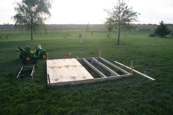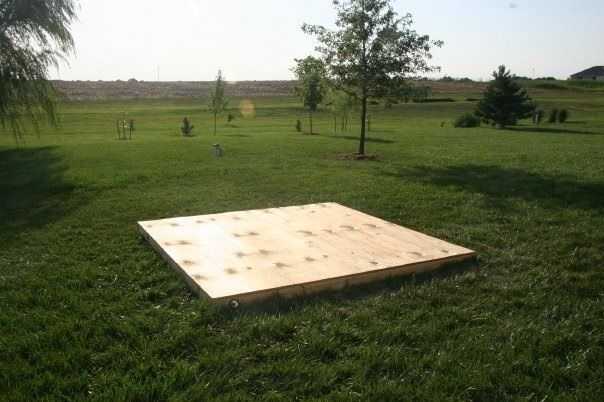 El piso es un marco de 8'x 8' de pino tratada a presión que se cubre con dos hojas de madera contrachapada de 3/4". Todo se atornilla juntos. Una fortaleza de madera es un buffet libre de termitas, no va a querer parte de la estructura a tocar el suelo. Planteamos nuestro y hecho nivel por cavar agujeros para cuatro bloques de hormigón cubierta inicialmente, pero mucho más tarde se descubrió con el peso de la fortaleza, nosotros debemos han utilizado seis. Se utilizó arena un poco en la base de los orificios para ayudar con la nivelación. Como se muestra en nuestros planes, asegúrese de que la pared frontal de la fortaleza se alinee con una viga de piso.