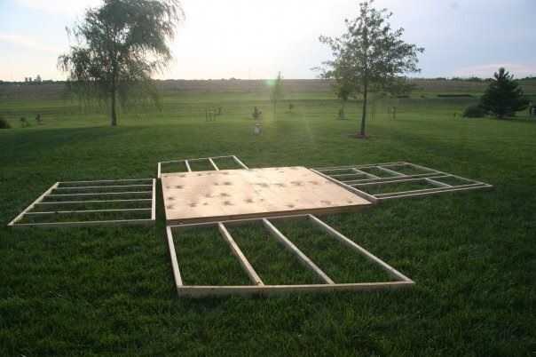 a continuación, hemos enmarcado las paredes sobre una superficie dura, lisa en el garaje de acuerdo a los planes. Después de que se completaron los cuadros, pequeñas manos agarraron un extremo y nos skedaddled al patio trasero, puso en el suelo, rompió esta foto, luego le robaron algunos caballos.