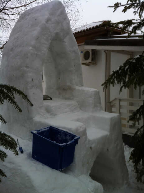 Teníamos cantidades anormales de nieve en Rumania así como sorprendentemente bajas temperaturas (-15ªC) no logramos terminarlo como la rotura de plazo medio vino y fuimos de vacaciones. Además, se está poniendo realmente caliente (-1 a 3ªC) que significa que tenemos que esperar más para que los bloques congelar, deberíamos seguir este proyecto. La estructura principal, sin embargo, debe soportar esas temperaturas, incluso cuando tiene el sol mirando hacia abajo sobre ella - la capa de hielo superficial de la estructura derrite sólo ligeramente y luego volver a congela durante la noche.