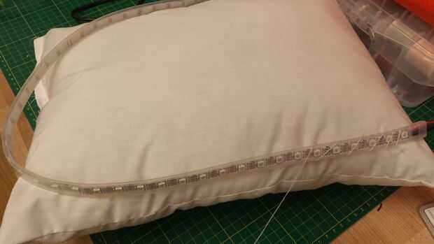 o pone la tira de Led alrededor de la almohada antes de colocar la cubierta de la tela translúcida. Punto ligeramente en lugar