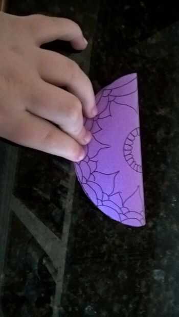 Doblar el círculo por la mitad pero no pliegue! Ahora toma tu dedo medio y coloque en el centro, ahora utilice el dedo pulgar y el dedo del anillo para tirar luego juntos.