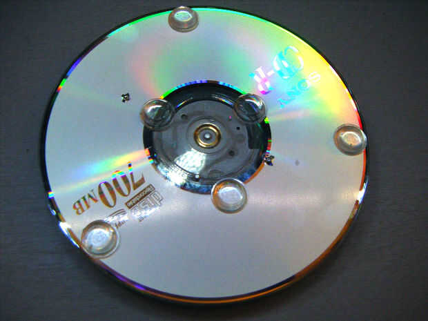 Dar el chisme algún tiempo para que el pegamento se seque y Voltéela boca abajo. Luego pegar patas de goma en el parte inferior CD. Usted necesitará por lo menos 6-tres en el borde exterior y tres más el medio para ayudar a soportar el peso de las piezas que voy tomando fotos de.