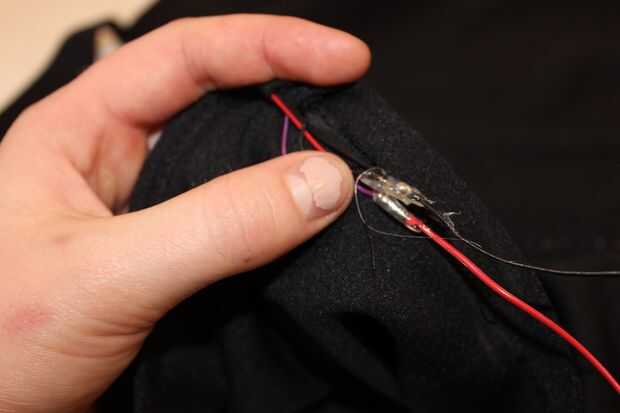 Crear cavidad de la batería: coser un poco de tela en tres lados en el interior de la tapa, que se ajuste a la pila y cualquier exceso de cable se acerca. Lo hice para que el tubo el cable en extendió alrededor de la parte inferior del bolsillo para no ver el cable.