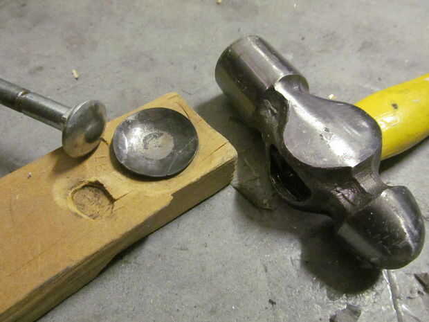 Para este paso se utiliza un perno de carruaje incluido y Plaza de la madera. Usted no puede estropear esto. Como usted martilla el disco entre la madera y el perno, se convertirá en un plato convexo. Todavía buscando buena.