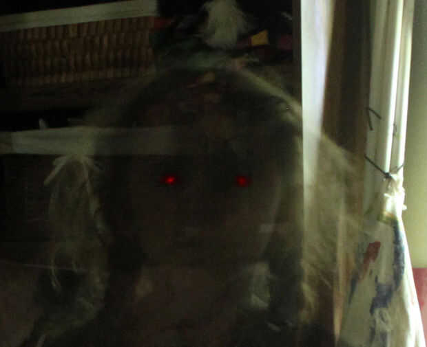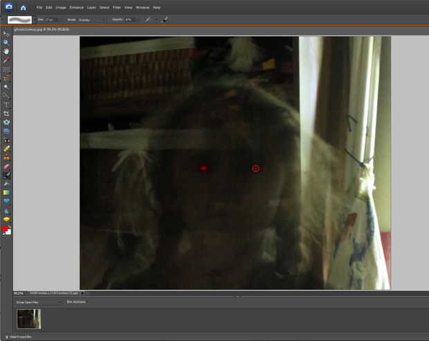 ahora toma tu fantasma mirando la foto y en que tienda de la foto y elegir la herramienta Pincel, tamaño de pincel de 27pixel, modo superposición, 47% opacidad. zoom en la cabeza y elegir su color de pincel en mi caso es de color rojo y color en la zona ocular general. y si lo desea pueden oscurecer o aclarar el terreno trasero.