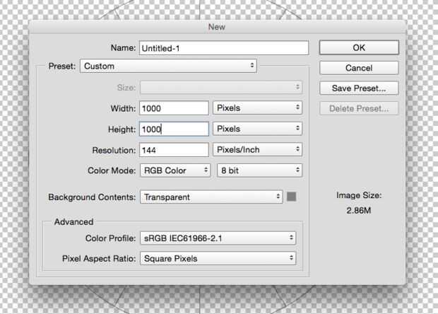 2. Haga click en 'File', 'Nuevo' y crear un archivo de tamaño cuadrado transparente (segunda imagen).