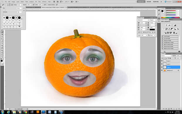 A continuación, pegar la letra V en el teclado para activar la herramienta "mover". Arrastrar los ojos y la boca sobre la imagen de la naranja y sobre todo listo! :)