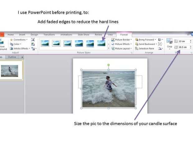 Corte la foto a tamaño para adaptarse a su vela (solo para tu información; Utilizar PowerPoint para mi foto para adaptarse a la vela antes de la impresión el tamaño).