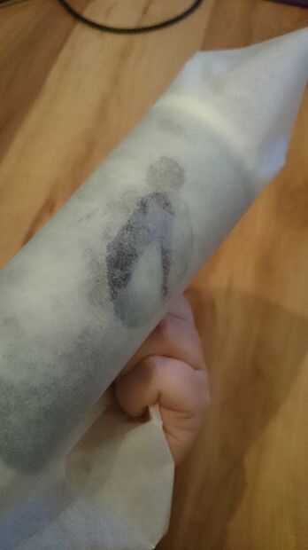 Con la secadora, comience cuidadosamente una sección de vela de la calefacción hasta ver la superficie LIQUEFY (Licuar) (se dará cuenta por un oscurecimiento de color como en la foto adjunta). Básicamente la cera se derrite a través del papel de tejido para sujetar a la superficie de la vela!
