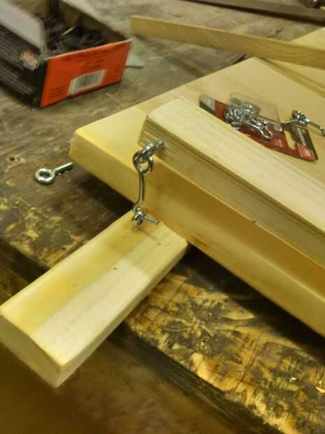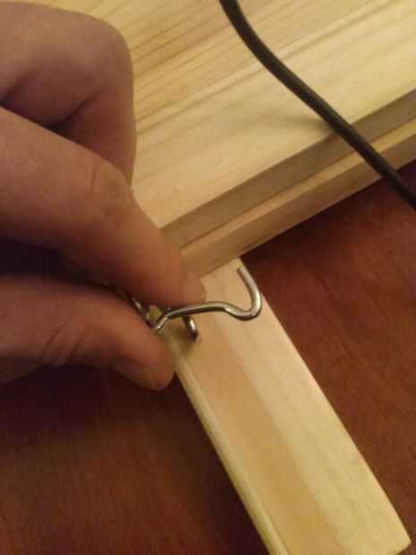Después de conseguir todo lo construido, me puse todo el hardware. Esto incluyó algunos seguros para mantener la imagen... en forma de imagen en lugar de desplegar inesperadamente en un estante. Debido a los ángulos de montaje en combinación con los ángulos que se fabricaban en los seguros de sí mismos, con un tirón mínimo los pestillos salieron de los ojales que aceptaron. Porque esto sería un montón de no buena, más doblada los seguros para establecer una conexión más positiva con los ojales.