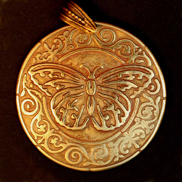 Anterior: medallón de bronce mariposa fotografiada en el estudio de luz de jarro de leche. Usé un metal repujado placa y Goldie Bronze arcilla para hacer el medallón. Pátina: Vintaj "arcilla" y "bronce envejecido" por encima de la de bronce luego sella con una laca del metal
