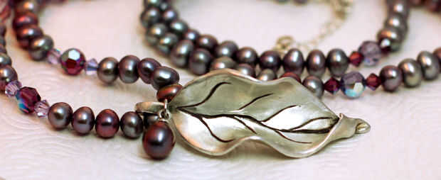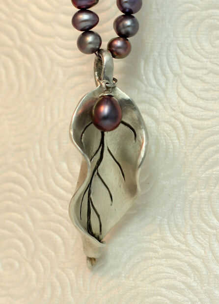 Foto #7: Fotografiada a través del extremo de la caja de luz: colgante hoja plata fina (pasillo de la manía tiene una similar de acero inoxidable, quería una de plata fina) w pavo real agua dulce perlas y cristales Swarovski. Acabado plata mate