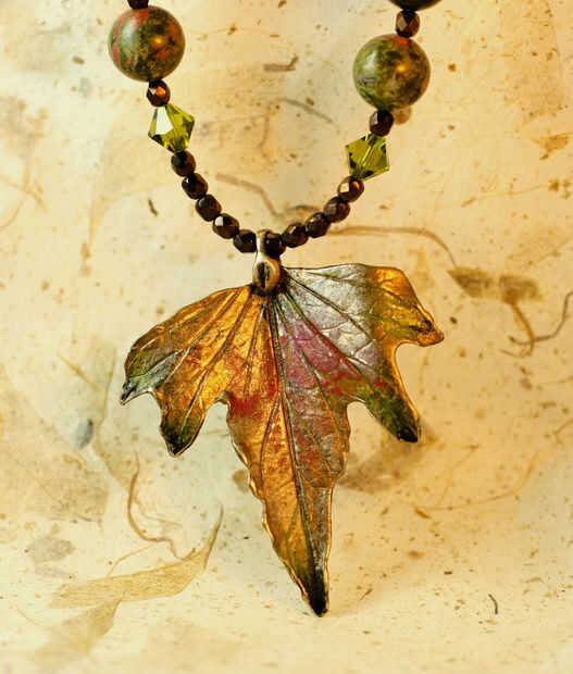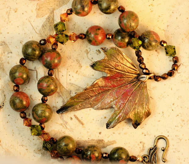 Foto #1: Tomado de frente de estudio: bronce hoja w Vintaj pátina, Cinabrio, musgo, latón antiguo y negro collar de cristales de Swarovski y perlas unakite; papel de tejido de hoja regalo bolso que tenía colocación alrededor