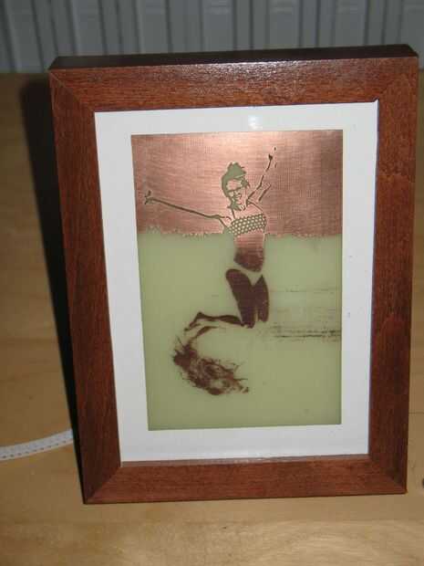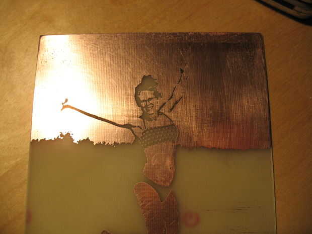 Pensé en hacer algo con una imagen pero eso es algo aburrido. Pero de repente recordé que había grabado una foto en un PCB para un amigo. Que era perfecto para ella, sé que le gustaría. Yo jugaba con photoshop y finalmente decidido para un cuadro que hice a blanco y negro y luego utiliza el método de transferencia de tóner para transferir a PCB. Había algunas áreas grandes que algunos pequeños agujeros en ella así que tuve que rellenar con un lápiz especial. También creo que debo tengo swiched el blanco y negro pero trabaja poco agradable de todos modos. Terminé el cuadro rociando con un spray transparente para los tableros de circuito protección oxidantes y feo.