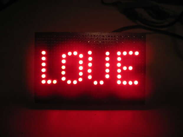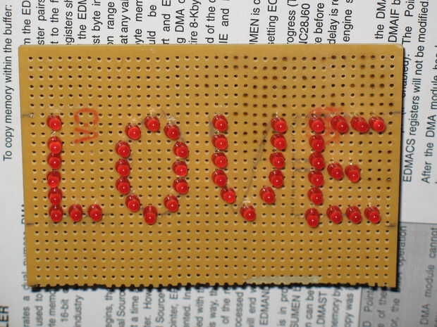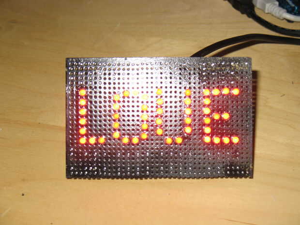 Pero sólo tenía muestra amarilla y que no funcionaría, así que cogí mi bolsa de LED 3 mm rojo, había comprado barato de Hong Kong y comenzó jugando con un tablero de prototipo. En el artículo pintaron blanco pero quería la Junta a desaparecer y sólo muestra el texto por lo que he pintado negro. Añadí un cable USB para la energía y poner un montón de resistencias SMD porque eso era todo lo que tenía en casa con 220 ohmios.