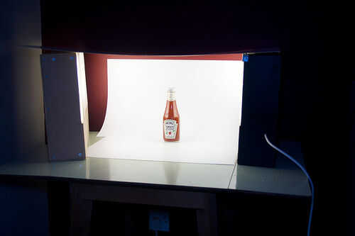 Para objetos más grandes, uso una longitud de 2m de material de blanca cortina blackout, que es laminado con plástico en un lado por lo que cubre bien y es menos propensa a arrugas. [Fig. 5] Las lámparas de trabajan mucho mejor para objetos más pequeños.