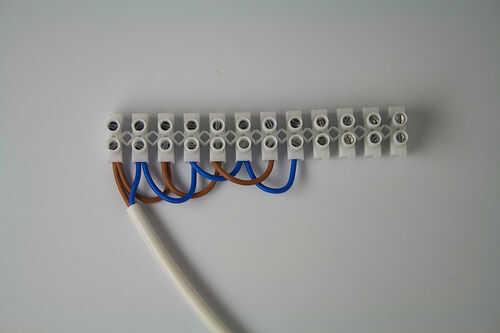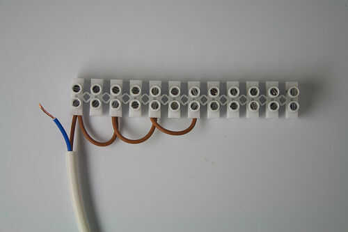 Conecte este cable a los dos primeros bloques a un lado de la regleta (vivo a la izquierda, neutra a la derecha), y luego encadenar cada alambre a bloques alternos, hasta que han cableado suficiente para todas las bombillas. [Ver imagen 1]