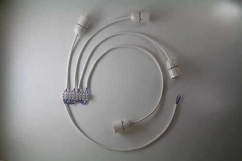 Cortar 4 piezas más de flex, uno para cada bombilla, permitiendo un cable un poco más larga para cada lámpara que se colocará más lejos de la regleta instalada. Mina eran aproximadamente 8" a 16" aproximadamente. Alambre cada uno de ellos hasta un sostenedor de la lámpara. [Ver Fig. 3]