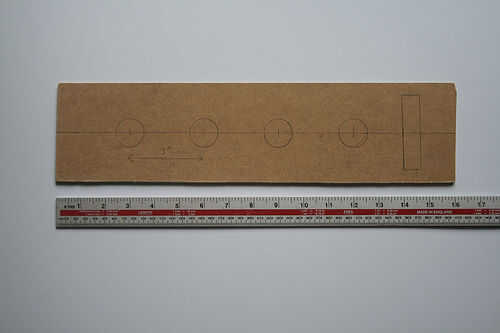Marcar en el MDF donde irá su portalámparas y regleta de terminales. Me permite 3" espacio entre los puntos centrales de cada bulbo, dando unos 1½" espacio entre cada bombilla instalada. [Ver imagen 1]