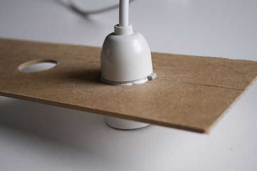 Empuje cada sostenedor de la lámpara en los orificios de que corte en MDF, con la cara blanca del MDF hacia adelante. Poner el portalámparas con el cable más corto más cercana a donde tu regleta será, movimiento más lejos con cada flexión mayor.