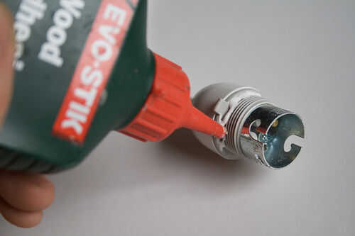 A extraer las vainas de cada portalámparas (la parte que normalmente se emplean para fijar la lámpara). Aplicar pegamento de madera en la rosca que ha de exponer. [Ver imagen 1]