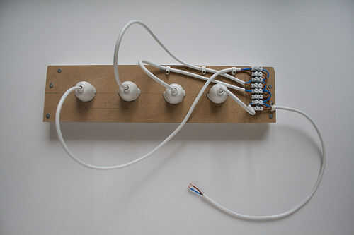 Necesita asegurar la regleta de bornes y los cables sueltos de la abrazadera hacia abajo. Esto se hace más fácil una vez han puesto madera abalorios sobre el panel. Porque MDF está compuesto de polvo comprimido, usted no puede hacer con tornillos. La cabeza del tornillo tendrá una hoja de MDF con seguridad, pero sólo cuando el hilo se enrosca en algo que se apoderará de él, como abalorios de madera.