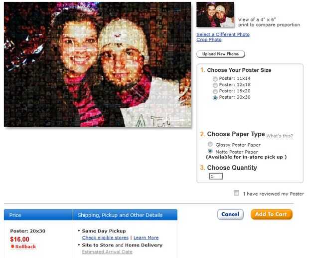 Fue $16 para la impresión con en la tienda de recogida. Tardó alrededor de una semana para que puedan imprimir y enviarlo al walmart.