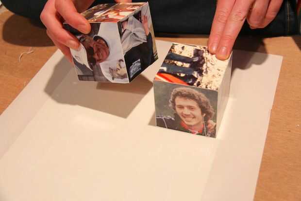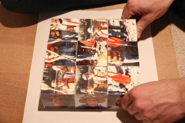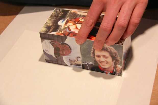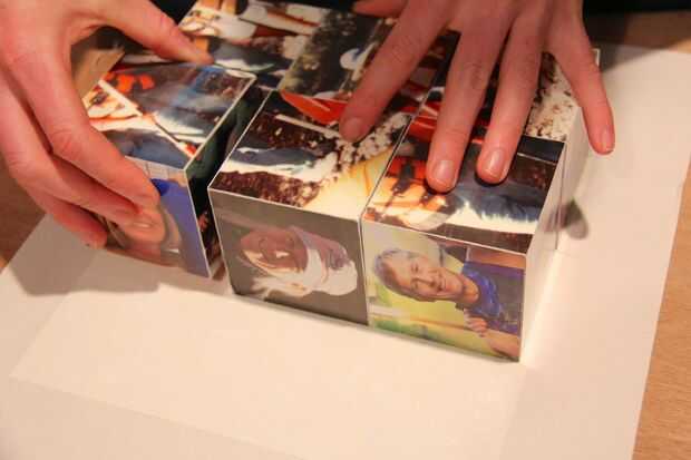 Coloque una parte seleccionada de los bloques hacia abajo en la parte posterior de la foto de la cubierta de pegamento. Asegúrese de que todos los bloques son rectos en relación con la foto como bien situado cara a cara.