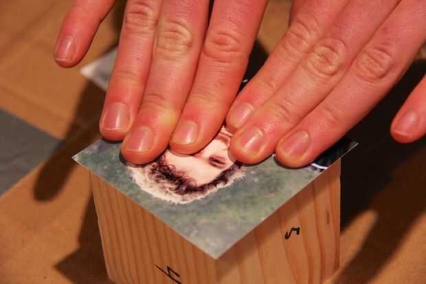 Presione firmemente hacia abajo en la foto para garantizar un buen pegamento. Al realizar este paso, asegúrese de que todas las fotos individuales se colocan en el mismo número en cada bloque, esto es importante después de las fotos más grandes.